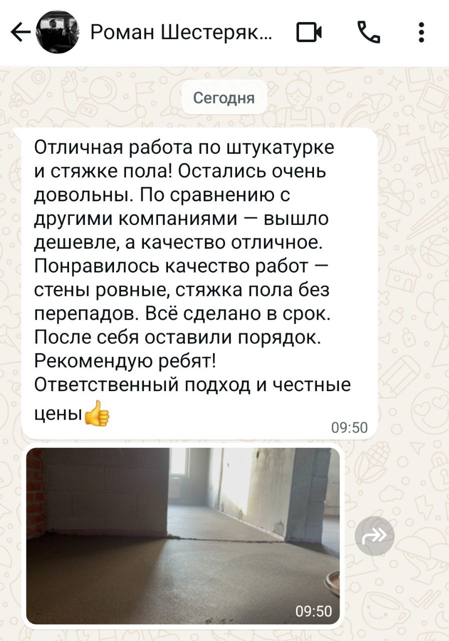 Наша команда может выполнить значительный объем работ за короткое время (например, 100-150 кв.м. стяжки за смену). Это позволяет завершить работы по стяжке пола в кратчайшие сроки, что особенно важно при больших объемах или сжатых сроках строительства.